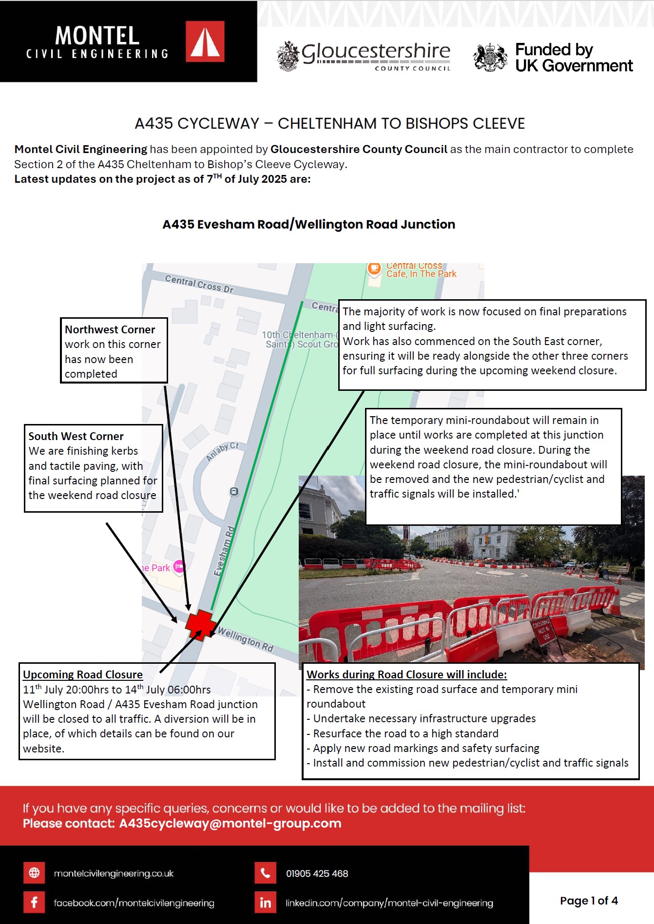 Latest updates on the A435 Cycleway construction and upcoming road closures.